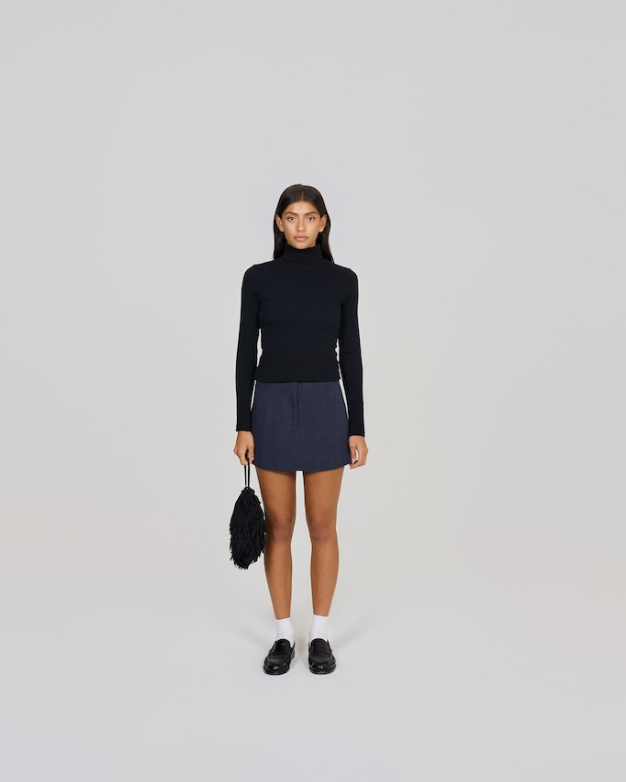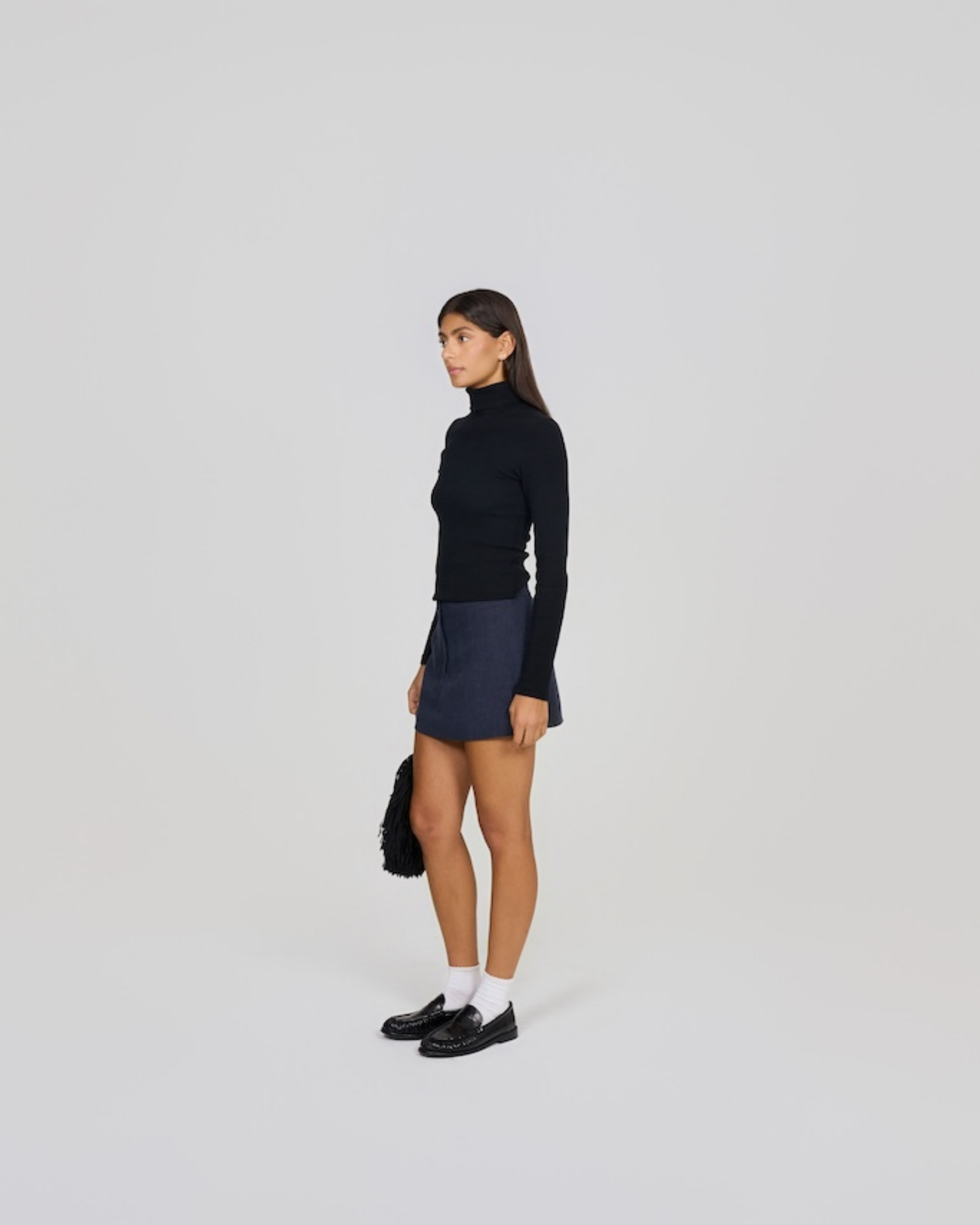 Model is a true Australian size 6/XS and wears a size 6/XS in the Navy Alias Mini Skirt.