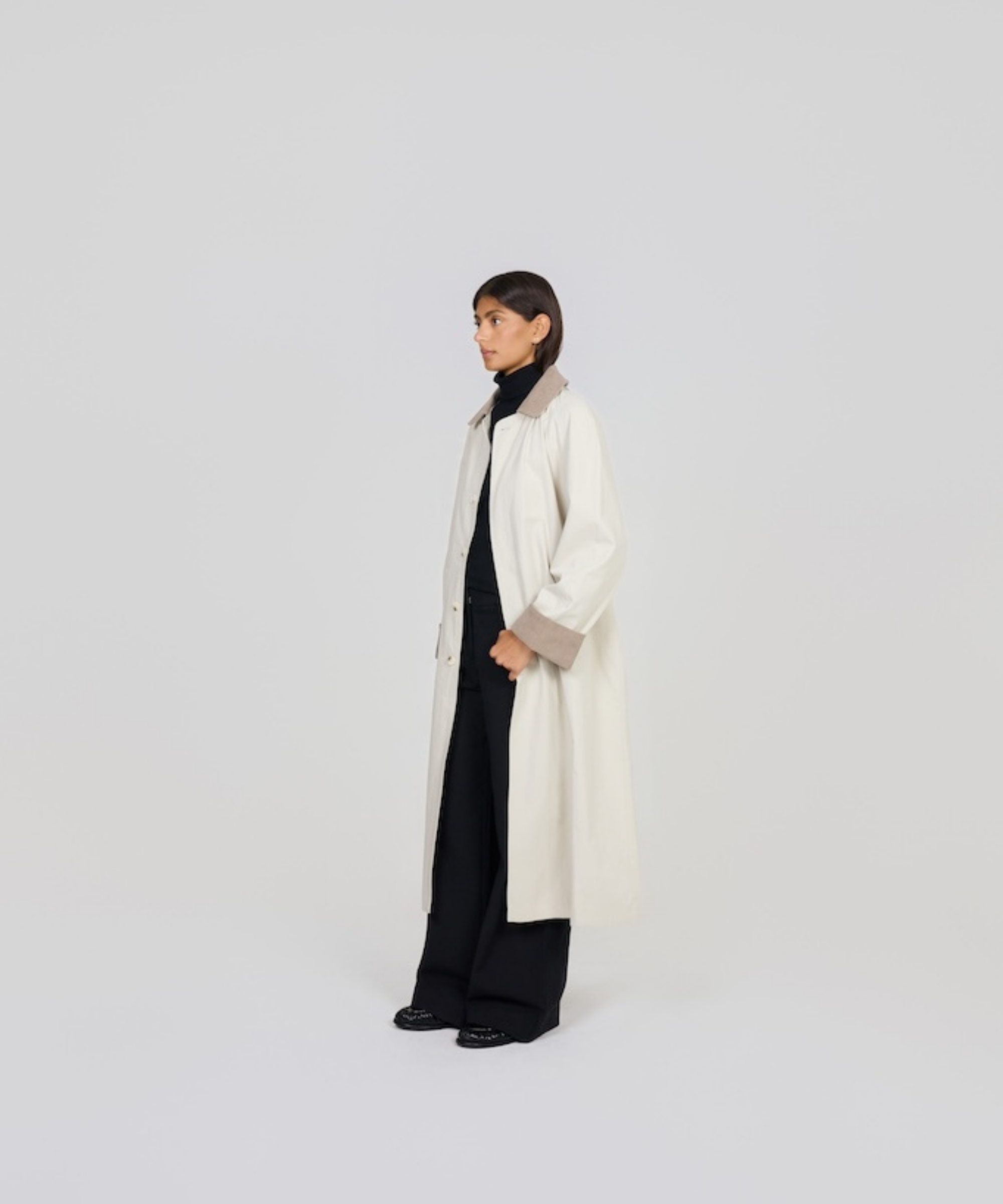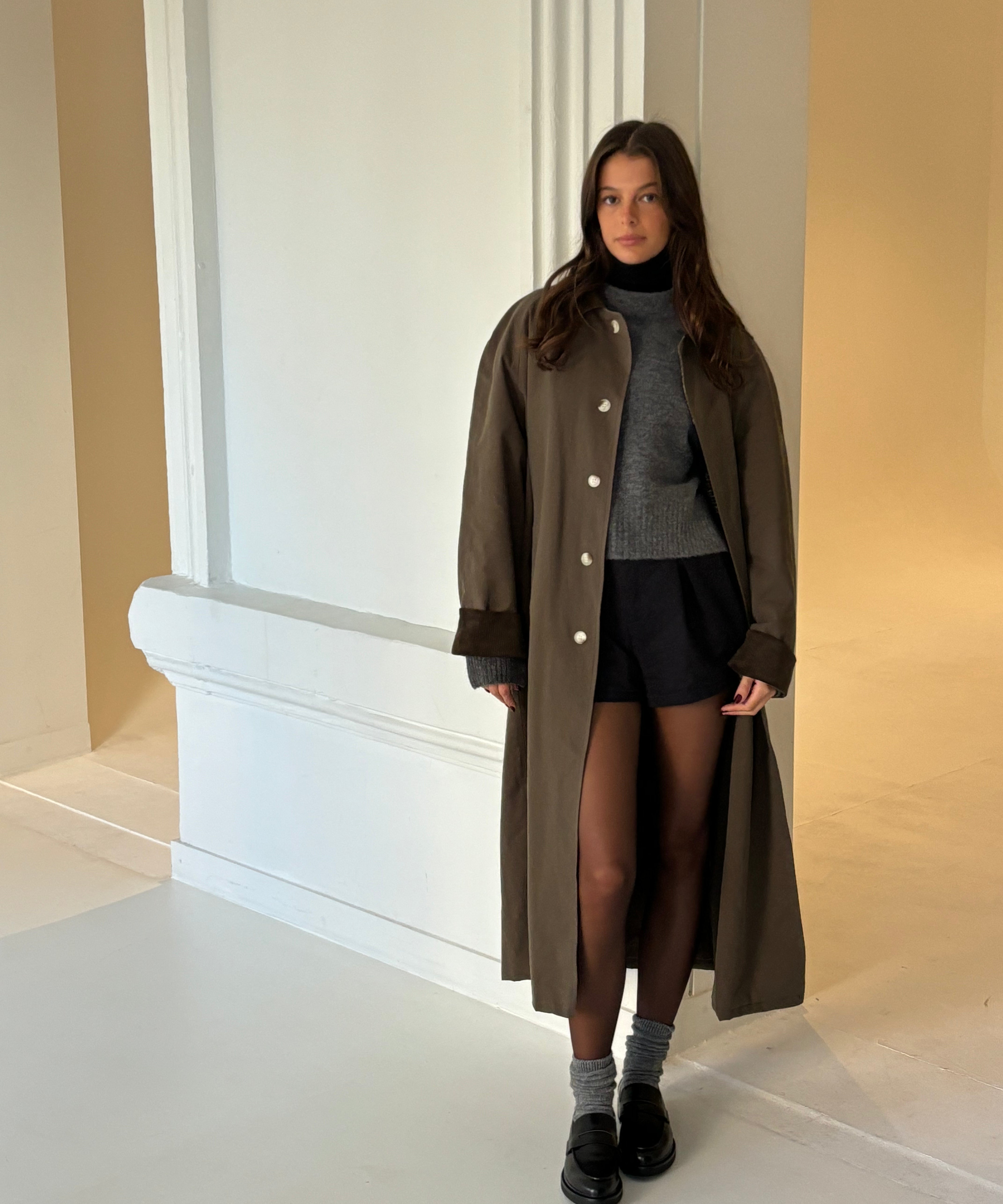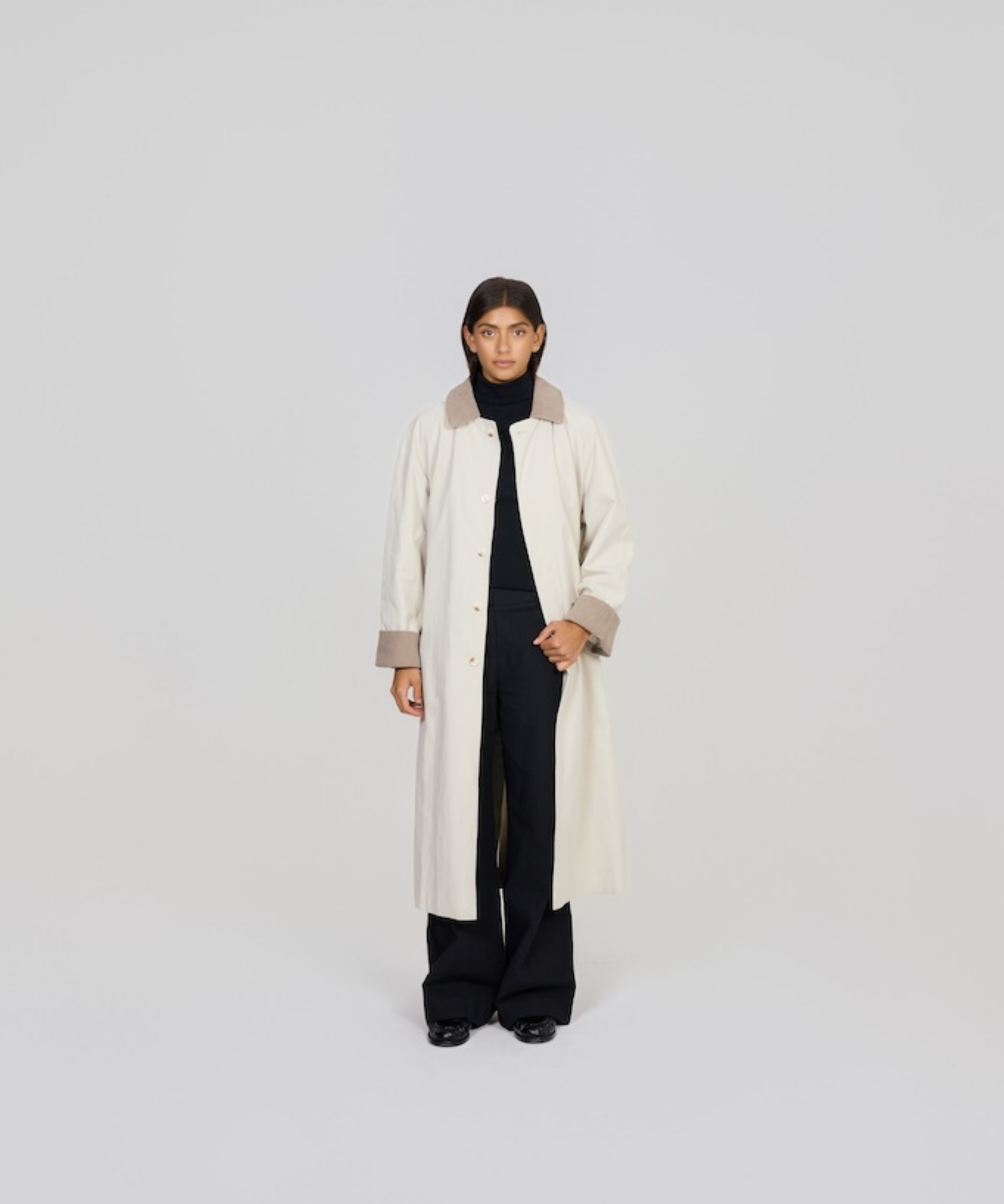 The Waiting Room is focused on creating elevated everyday essentials that can be easily worn day and night, The Waiting Room's Alannah Trench Coat in Dark is a Corduroy Collar Trench Coat that will become you most cherished winter garment.