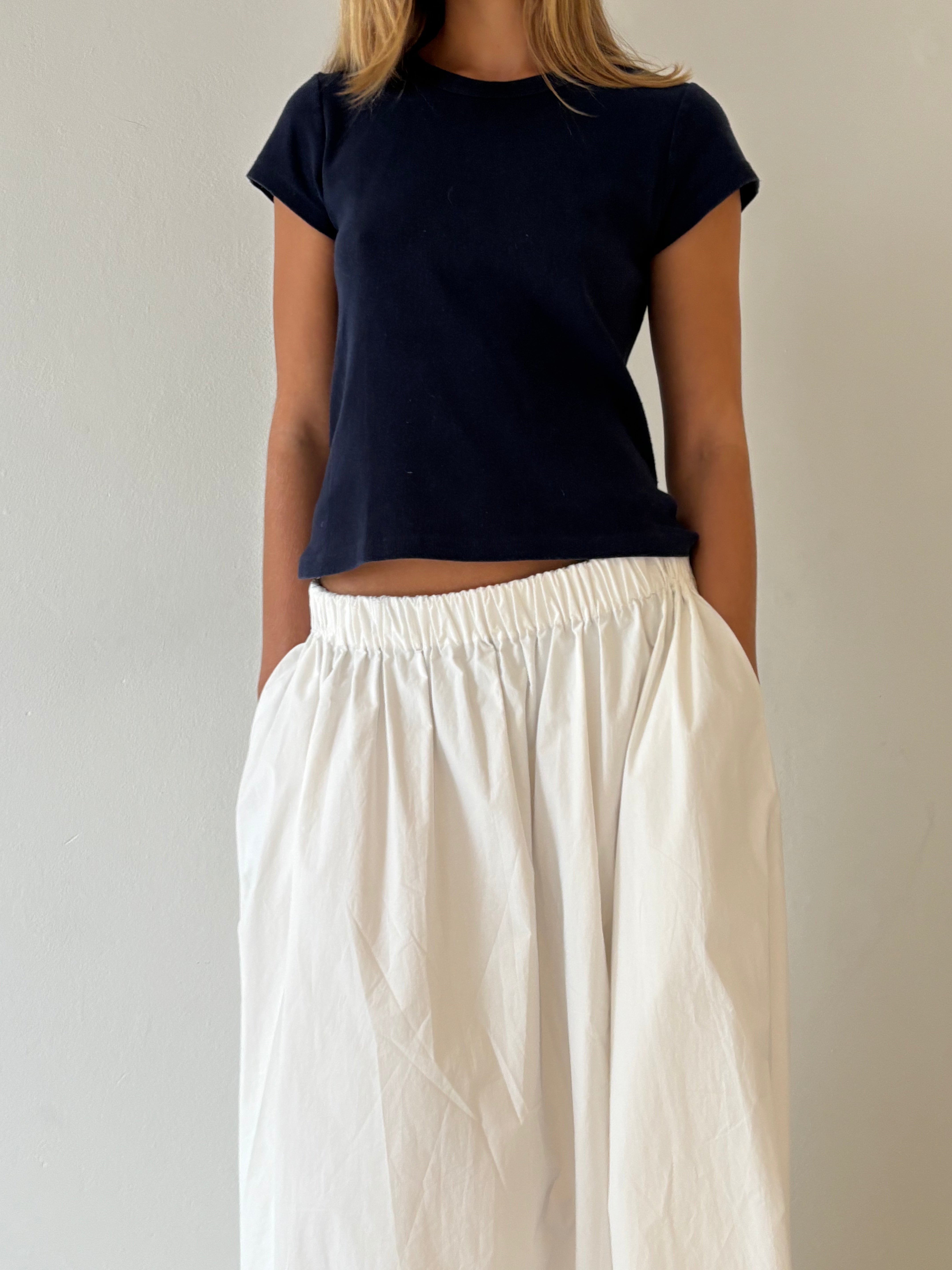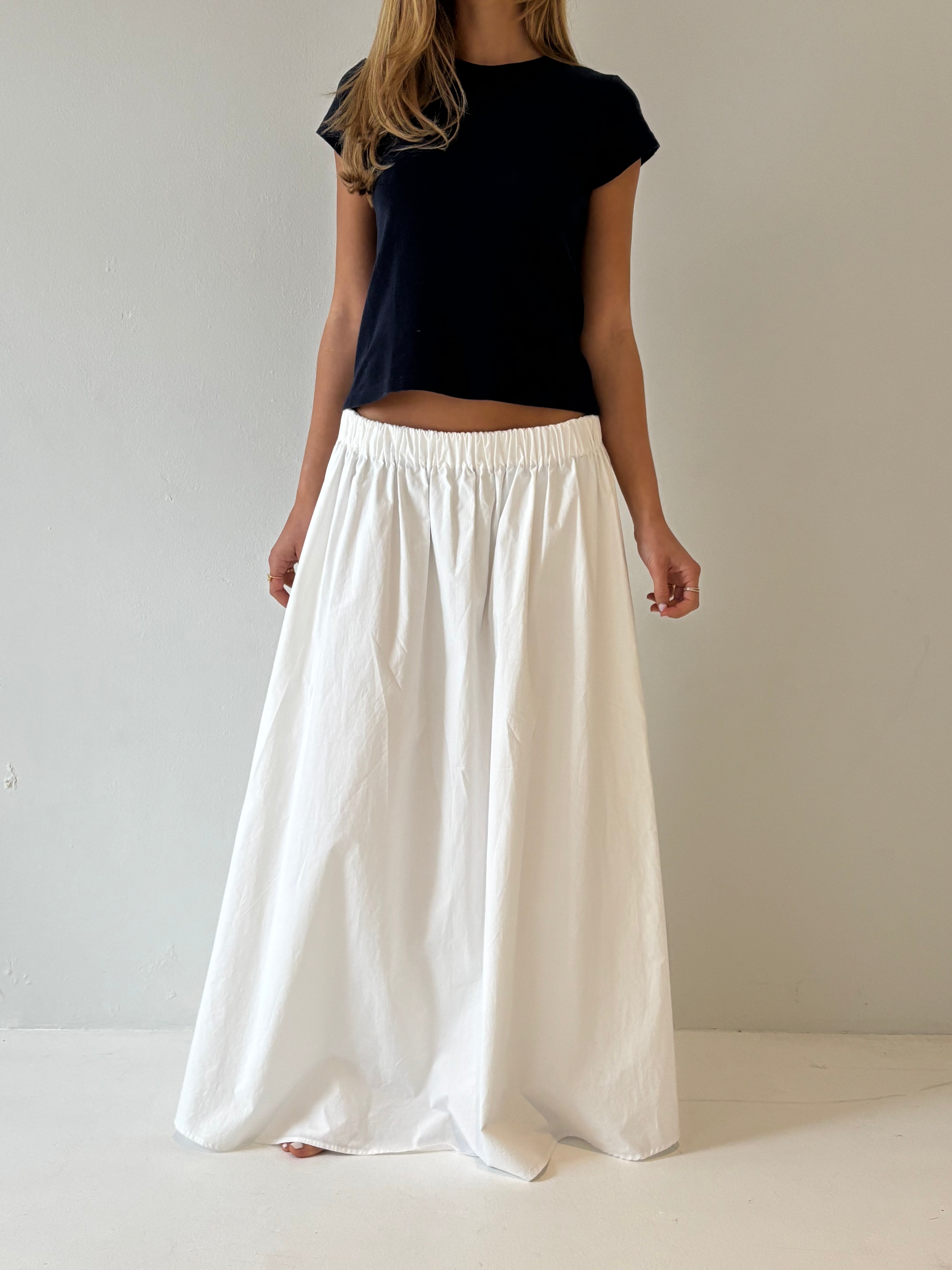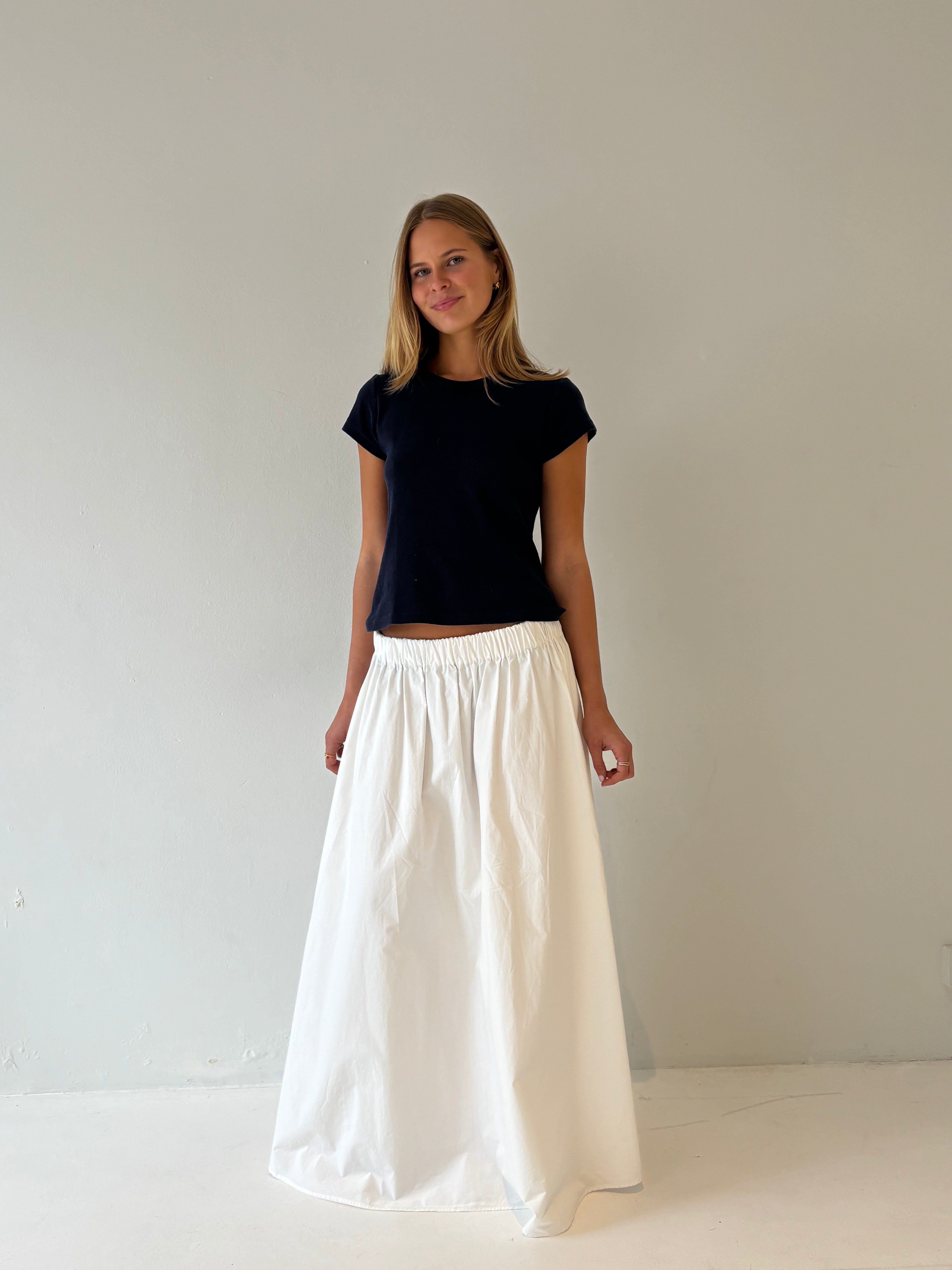 The Indy Skirt is a 100% cotton Maxi Skirt, with elastic in the waistband and pockets. You can wear the skirt low or high waisted for length versatility.